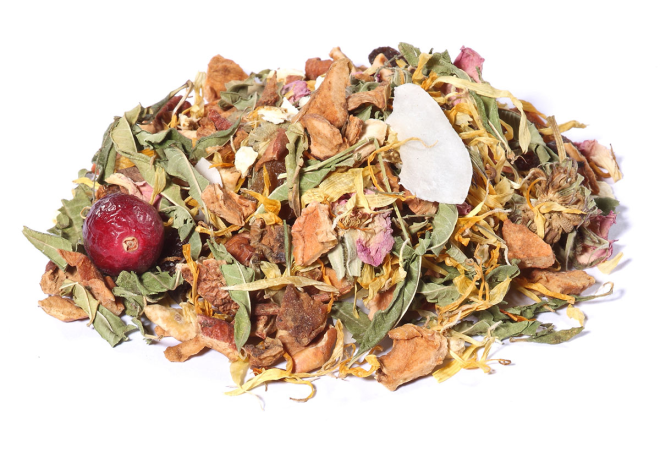 Pomme*, raisin (raisin, huile végétale)*, coco*, écorces de citron*, verveine entière*, arôme naturel, morceaux de pomme*, fleurs de souci*, pétales de rose*, canneberge*, feuille d’airelle rouge*.