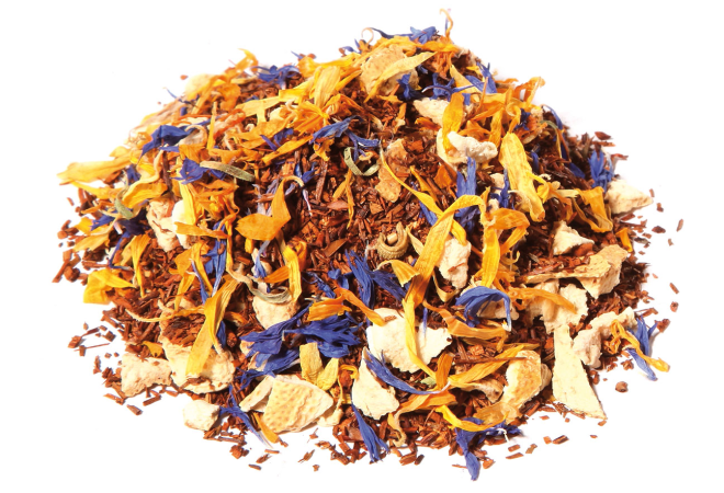 Rooibos naturel*, arôme naturel, écorce de citron*, fleurs de souci*, fleurs de bleuet*.