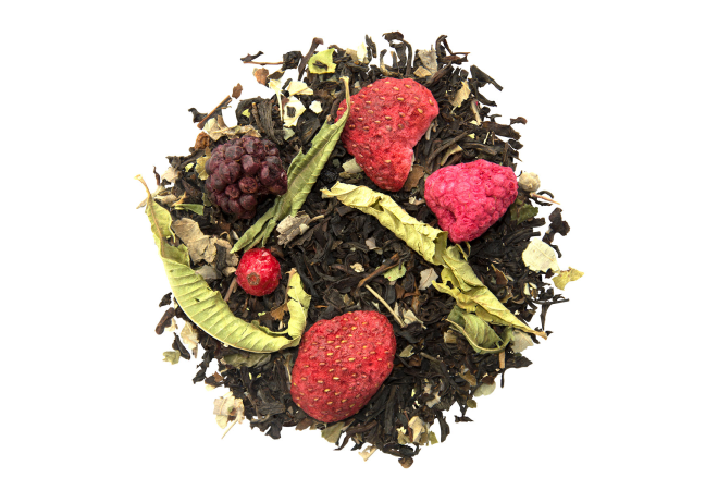 Thé noir Assam*, -Inde du sud*, feuille de mûre*, arôme naturel, verveine entière*, raisin (raisin, huile végétale)*, baie de sureau*, framboise*, mûre* (2%), fraise*, cassis*, groseille*.
