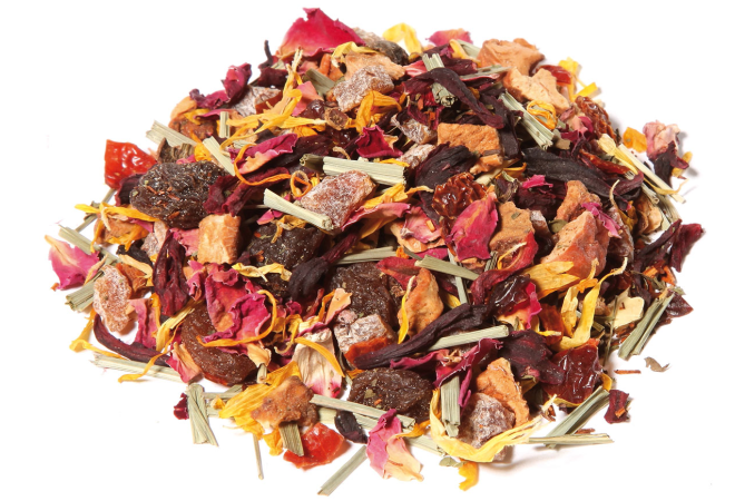 Pomme*, hibiscus*, citronnelle*, Rooibos naturel*, menthe*, raisin (raisin, huile végétale)*, cynorrhodon*, arôme naturel, fleurs de souci*, pétales de rose*, pêche* (1%).