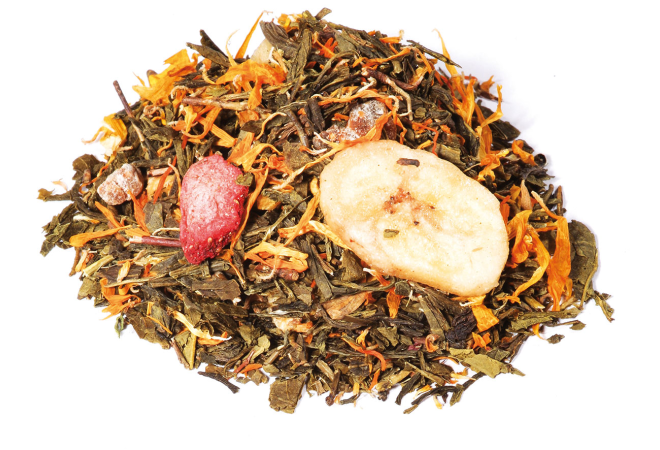Thé vert de Chine Sencha*, banane (banane, huile de noix de coco, sucre de canne, miel)*, arôme naturel, fleurs de souci*, fraise*, ananas*, abricot*.
