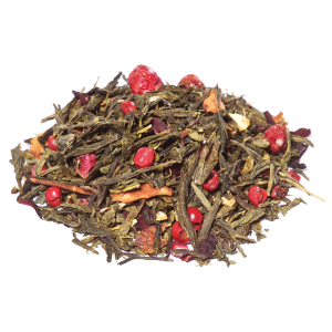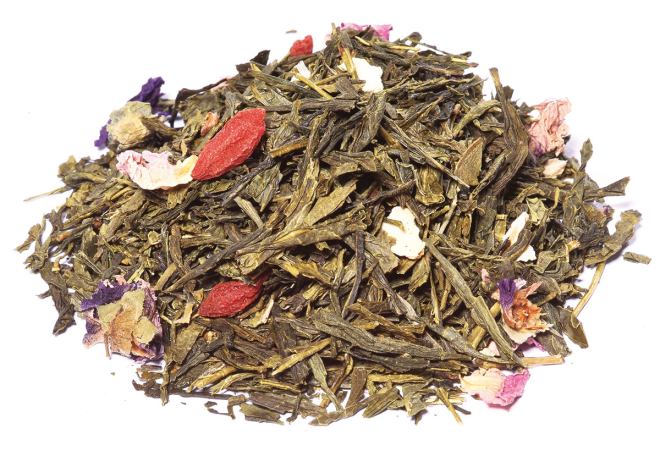 Thé vert de Chine Sencha*, baie de goji*, arôme naturel, écorce d’orange*, pétales de rose*, mauve*.