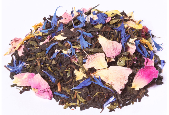 Thé noir Assam*, -Inde du Sud*, thé vert de Chine Sencha*, arôme naturel, papaye*, morceaux de mangue*, fleurs de souci*, pétale de rose*, fleurs de bleuet*.