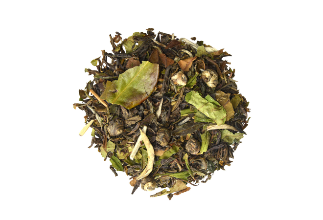 Thé vert China Jasmin* (69%), Pai Mu Tan*, China Jasmin Silverneedle* (3%), China Jasmin Dragon Pearl* (2%).