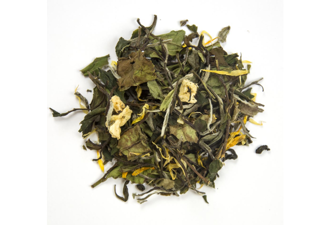 Thé blanc Pai Mu Tan*, thé vert China Chun Mee*, écorces de citron*, arôme naturel, fleur de souci*, ananas*.