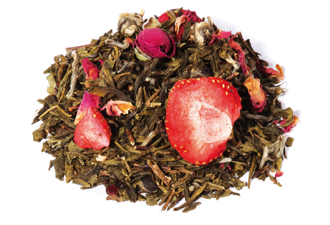 Thé vert Sencha* (Chine), thé vert Chun Mee* (Chine), écorce de Cynorhodon*, fleurs d’hibiscus*, arôme naturel de framboise, rooïbos* (afrique du sud), arôme naturel de fraise, thé blanc Pai Mu Tan* (Chine), arôme naturel de crème, feuille de stevia*, morceaux de fraise* (0,9%), morceau de framboise* (0,9%), pétales de roses*.