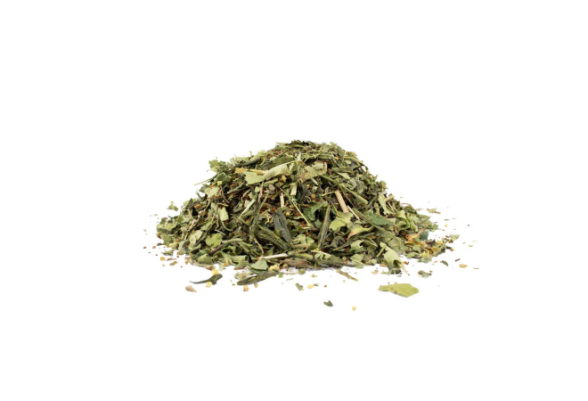 verveine de citron*, thé vert sencha* (Chine), anis*, manteau de Notre-Dame*, feuille d’ortie*, rooïbos* (afrique du sud),achillée millefeuille*, feuille d’ail*, fleur de sureau*, arôme naturel.