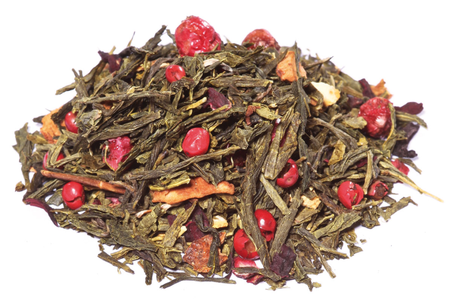 Thé vert de Chine Sencha*, hibiscus*, arôme naturel, china White Monkey*, pomme*, écorce de citron*, poivre rose*, groseille*.